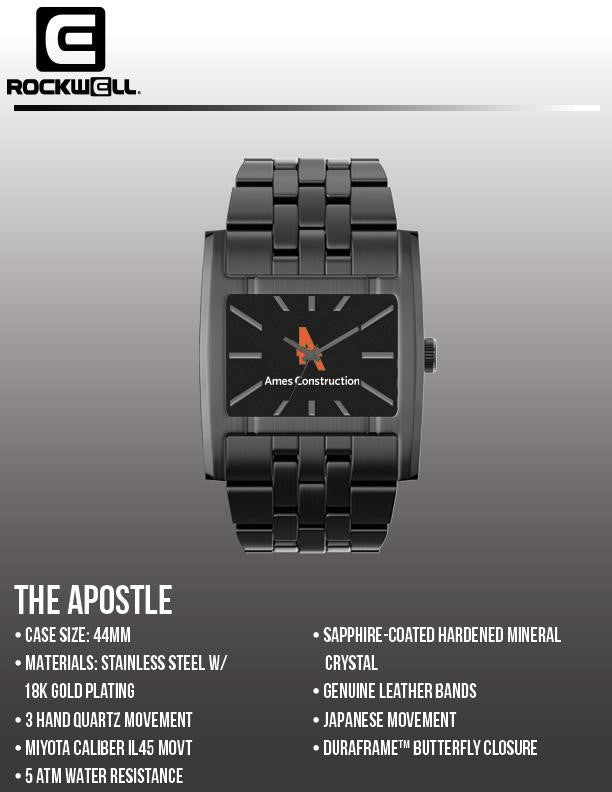 Custom-designed for Ames Construction, this one-of-a-kind version of Rockwell's Apostle will have you singing its praises. Aside from the indices marking the hours, the face bears only a red "A" and the words "Ames Construction" in white text. Simple not subtle; this watch proclaims to whom it is loyal. While our original Apostle features a stainless steel band, this one pairs with a genuine leather one for an elegant look and feel.