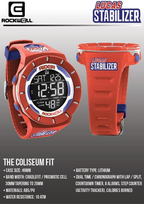 Ideal in both form and function, this Coliseum Fit, custom-designed for Lucas Oil, is a one-of-a-kind version of this popular watch. The case and band feature bright, eye-popping red and blue with white accents. The company's distinctive shield-shaped logo appears on one side of the band, while the other bears the words, “Lucas Stabilizer,” a flagship product of the company. The vivid color choices attract attention to these custom graphics and proudly proclaim the company name.